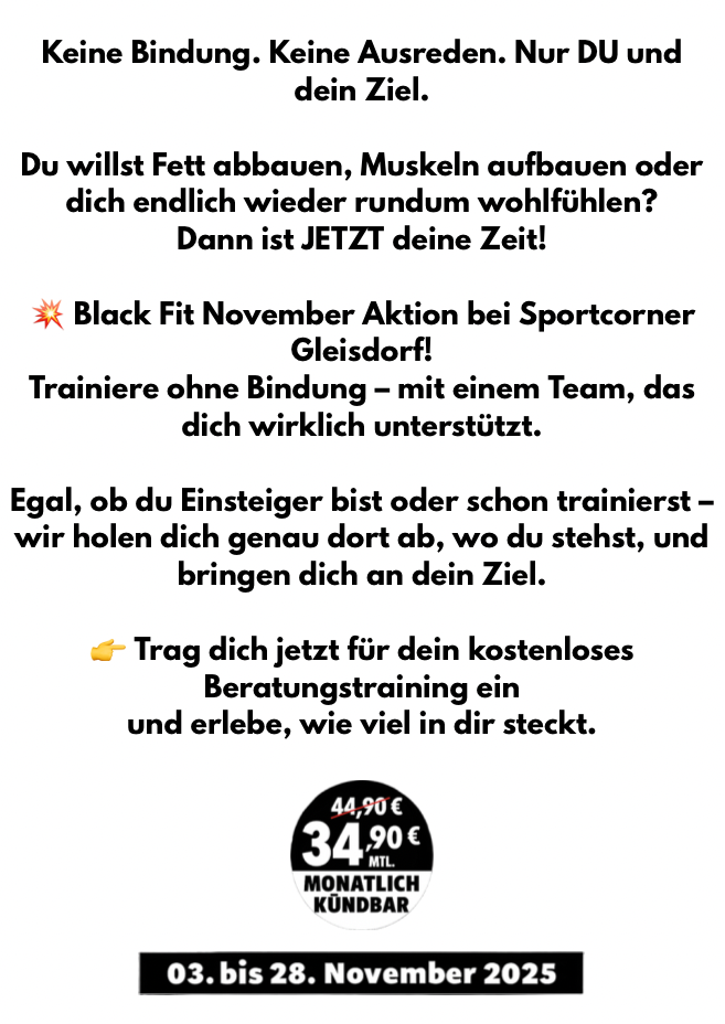 Im Anschluss zeigen wir dir gerne wie einfach Fitnesstraining auch für dich sein kann. Dafür nimm dir bitte zirka 1,5 Stunden Zeit.
